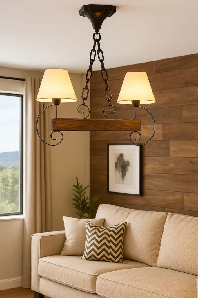 Colgante Hierro Y Madera Pantallas De Tela Rustico 2 Pantallas