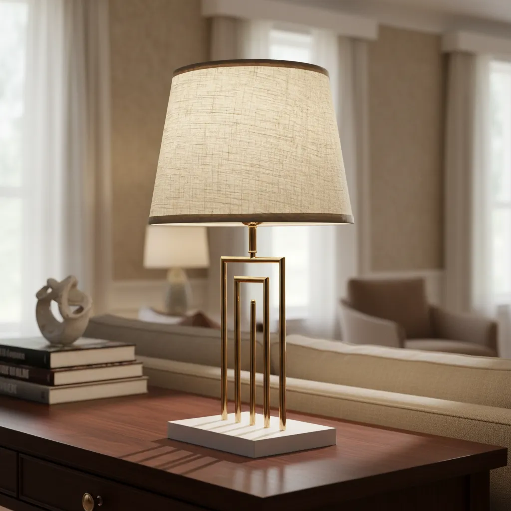 Su pantalla de tela combina a la perfección con la estructura de metal dorado, creando un contraste visual que realza cualquier decoración. La tecnología de iluminación LED garantiza una luz cálida y acogedora, ideal para momentos de relajación o para iluminar cenas especiales.