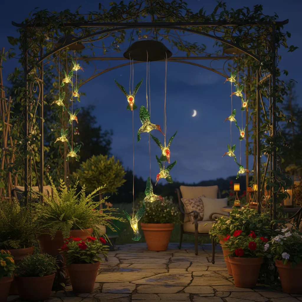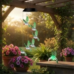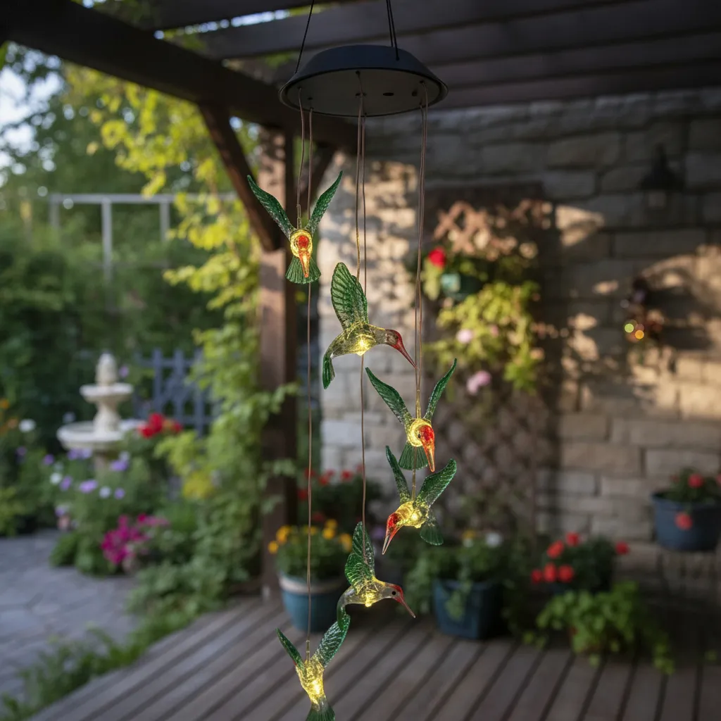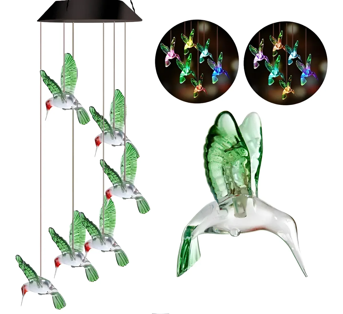 IDEAL PARA INTERIOR Y EXTERIOR • Dale un toque moderno a tu hogar con este luminoso colgante de colibrí, posee 6 hermosas figuras con LED interior y batería recargable con el sol!