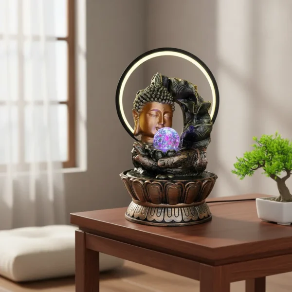 Ideal para espacios interiores o exteriores, esta fuente es perfecta para quienes desean mejorar su entorno con un elemento que promueve la calma y la armonía. Añade un toque de espiritualidad y elegancia a tu hogar con la Fuente de Agua Buda Cantaros con Luz, y disfruta de sus beneficios para el cuerpo y la mente.
