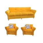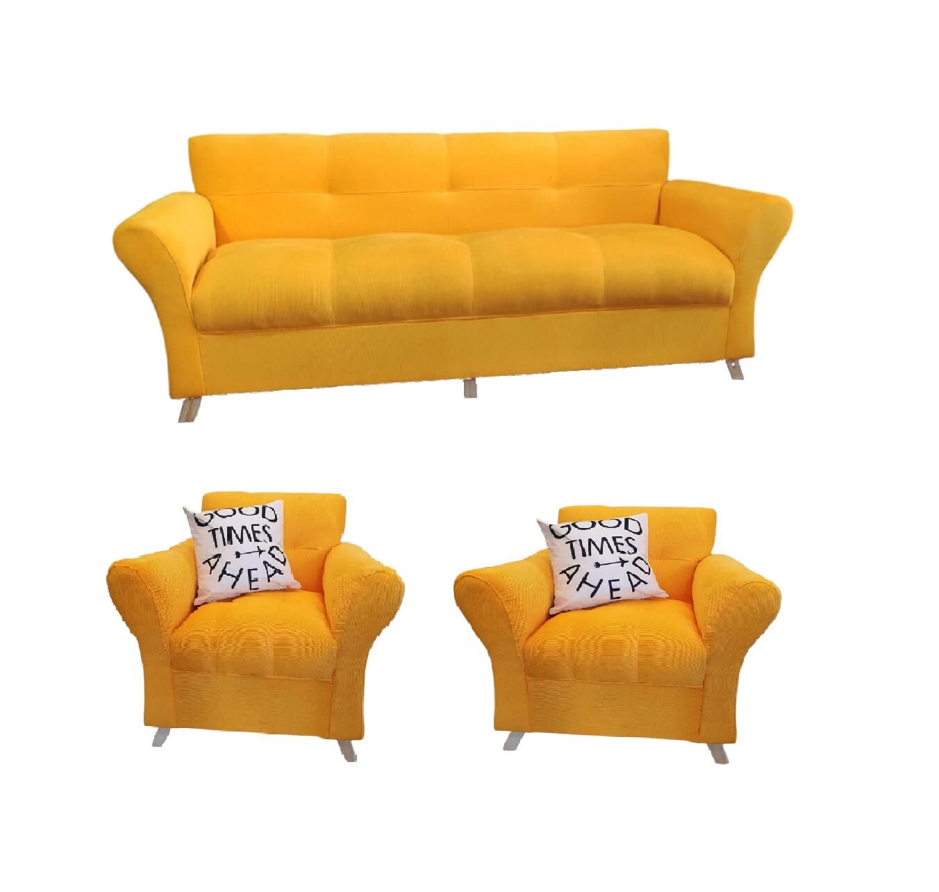 El juego incluye un sillón de 3 cuerpos y 2 butacas, todos tapizados en tela de alta calidad. Las patas de madera en color marrón complementan el diseño, aportando calidez y sofisticación al ambiente. Además, no requiere ensamblado, facilitando su instalación en tu hogar de forma rápida y sencilla.