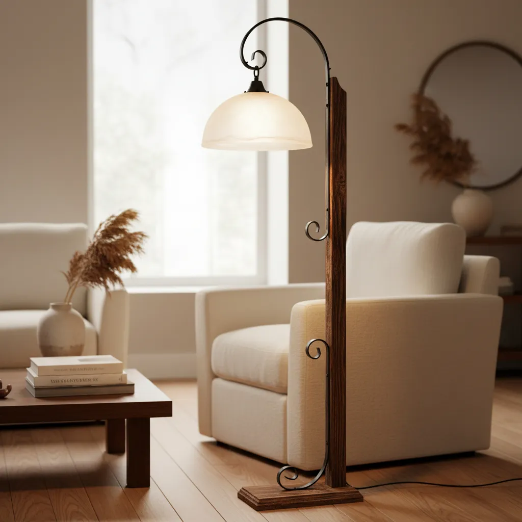Lampara De Pie Portátil Hierro Madera Maciza Campana Vidrio