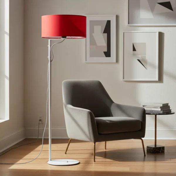 Luminaria Lampara De Pie Industrial Blanco Pantalla Tela Rojo